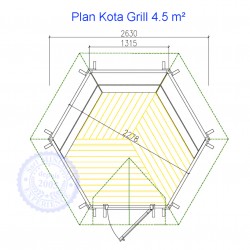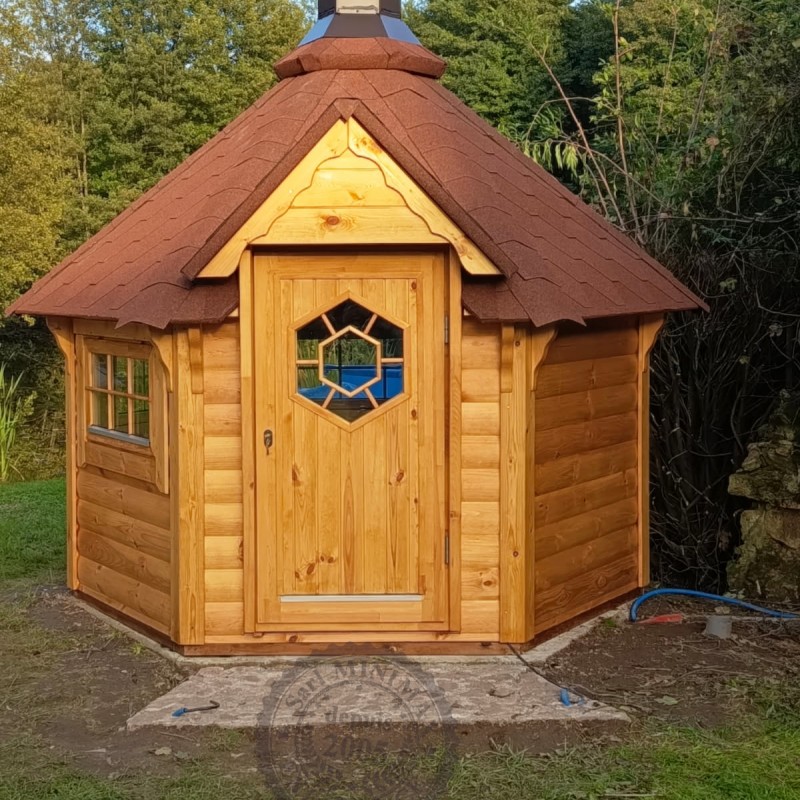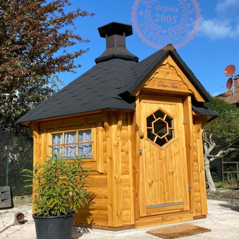 Le Kota Grill finlandais 4.5 m² est idéal pour les petits restreint, ou les ambiances intimes. Sa forme hexagonale et la large épaisseur des murs : 45mm en font un Kota résistant et élégant.
